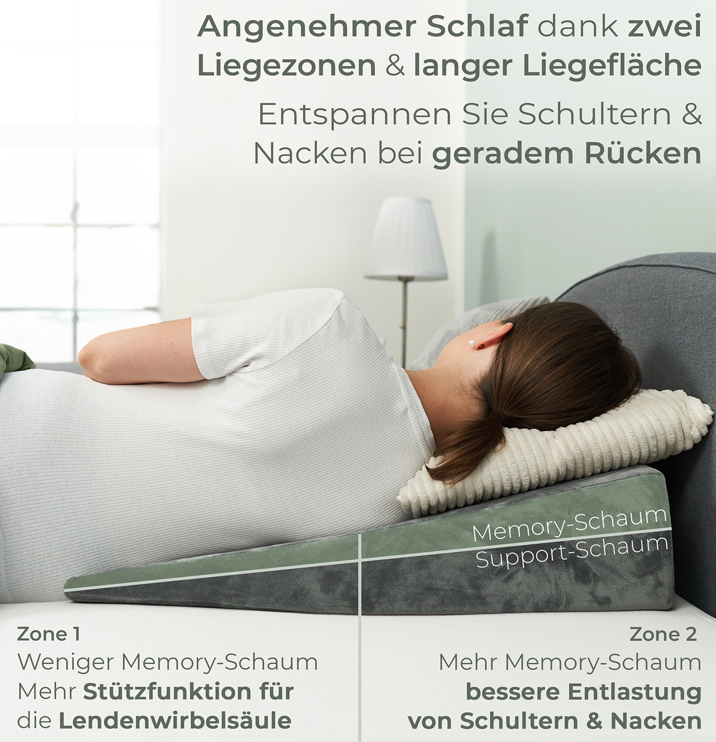 Perfekt abgestimmte Schaumstoffe sorgen für die optimale Rückenstütze. Das Keilkissen bietet einen weichen Übergang zur Matratze, damit das Bettkissen eins mit der Matratze wird und der gesamte Rücken auf dem Kissen Platz findet. Somit werden Ihre Wirbelsäule und der gesamte Rücken gerade gehalten, während Sie die volle Entspannung genießen.